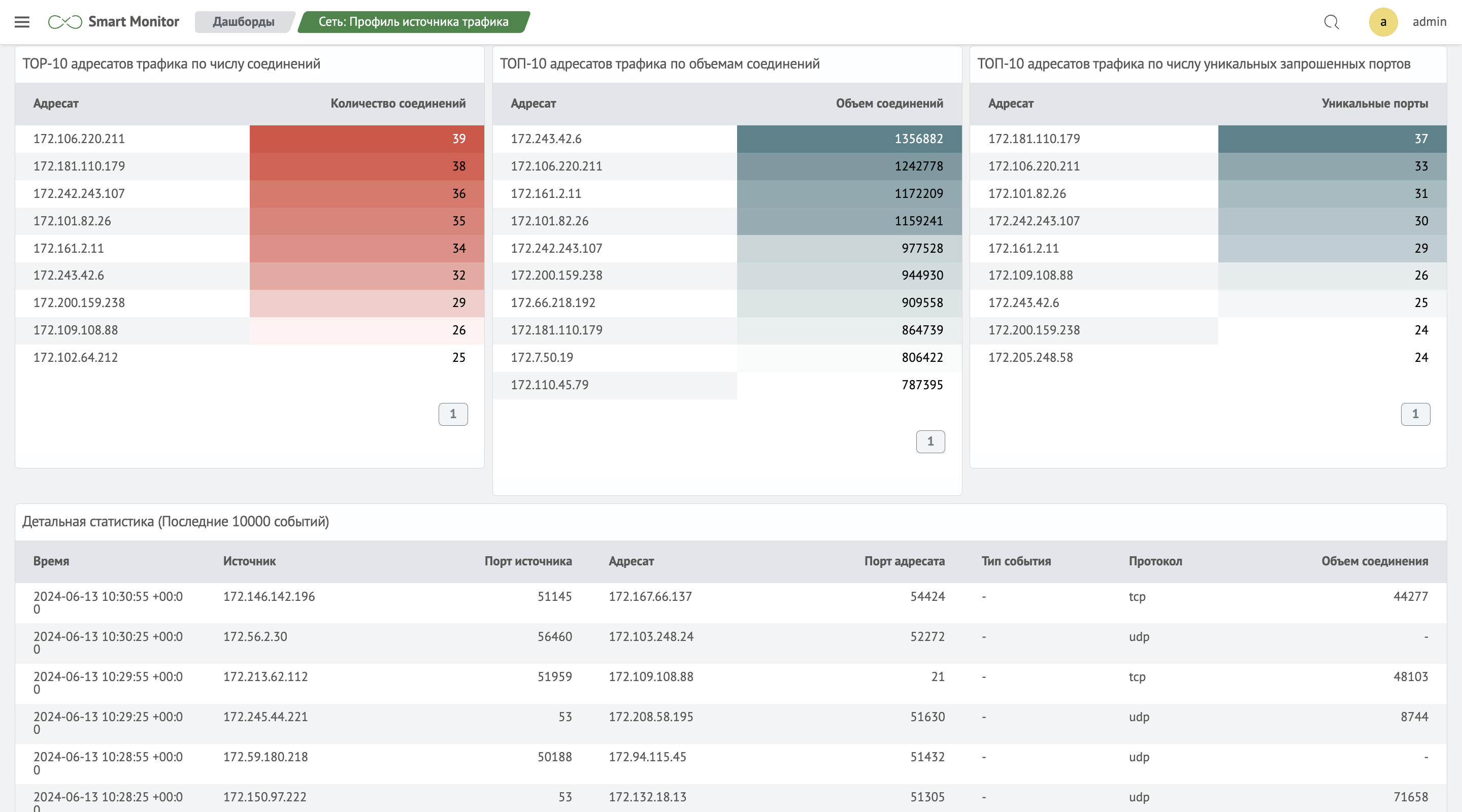 В корреляционном запросе можно обращаться сразу к нескольким хранилищам и записывать результат обработки в любое из них. Полученные результаты поисковых запросов могут быть представлены в различной визуальной форме и сохранены в дашборд, доступный для указанных в ролевой модели группе пользователей.