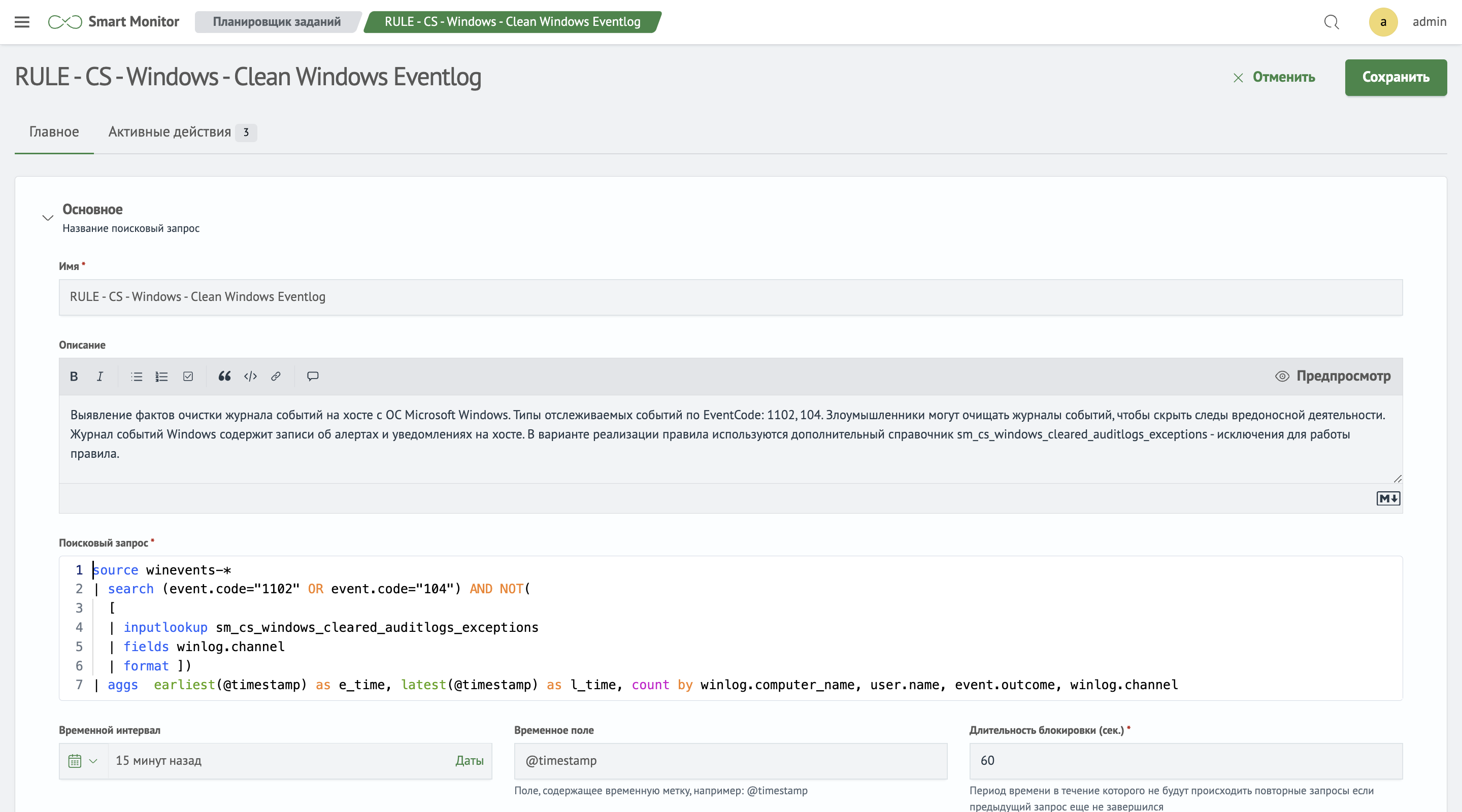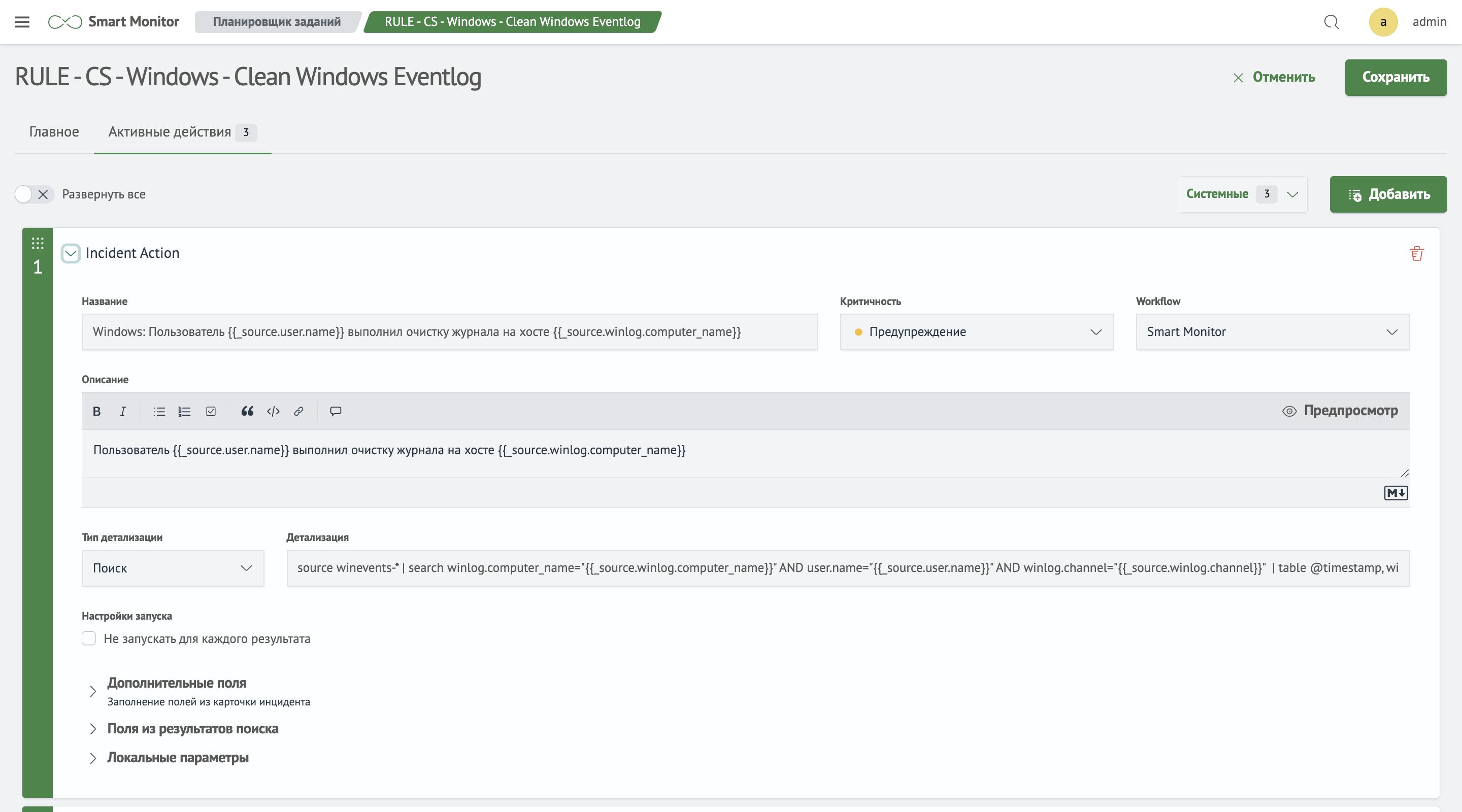 Инструмент Job Scheduler представляет собой планировщик заданий для автоматизированного запуска корреляционных запросов и определения реакции на их исполнение (отправка уведомлений, запуск скриптов на оборудовании, формирование инцидента).