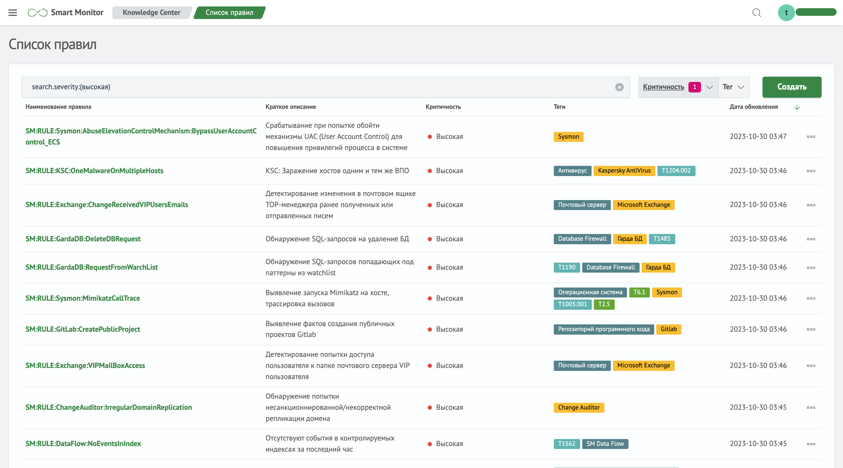 В состав Cyber Security входит набор правил выявления инцидентов ИБ. Правила категорируются по степени критичности, тегированы, исходя из типов событий и источников данных, на которых базируются.