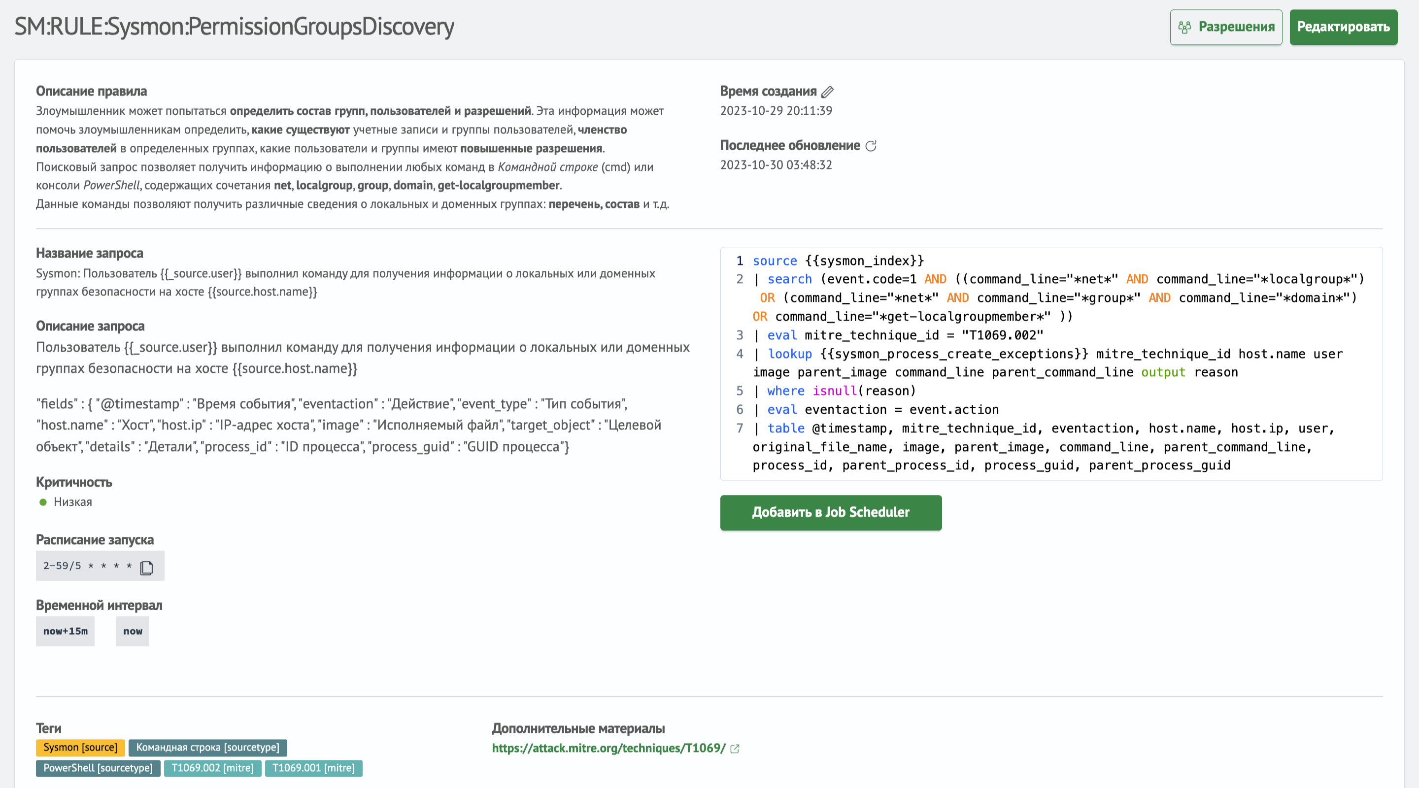 Помимо тегов, относящихся к используемым источникам данных, правило может иметь теги, соответствующей техники базы знаний MITRE ATT&CK, CVE, либо произвольный пользовательский тег.